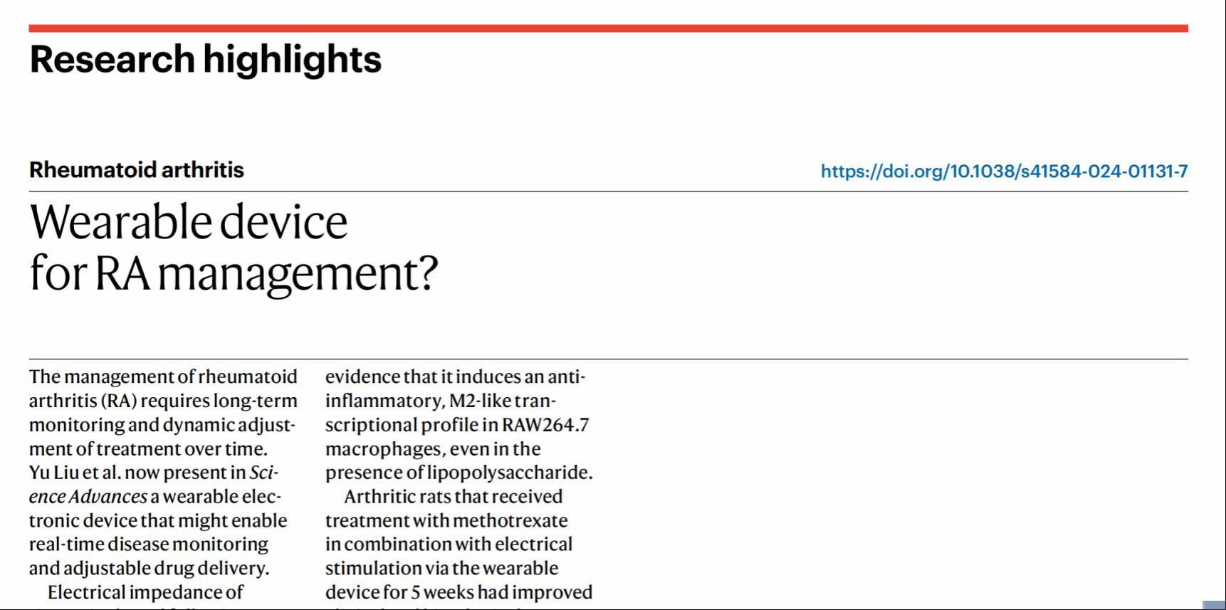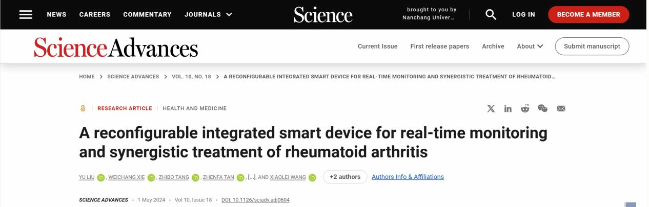 本網訊(國家光健康材料雙一流學科特區實驗室)近日,國際知名期刊Nature Reviews Rheumatology(IF: 33.7)對題為“A reconfigurable integrated smart device for real-time monitoring and synergistic treatment of rheumatoid arthritis”(一種用于實時監測和協同治療類風濕關節炎的可重構集成智能設備)”的研究工作進行專文評論。據悉,該項研究工作是由南昌大學光健康團隊的王小磊教授與南昌大學第二附屬醫院的羅軍教授合作完成,研究成果于2024年5月1日在Science Advances上發表。